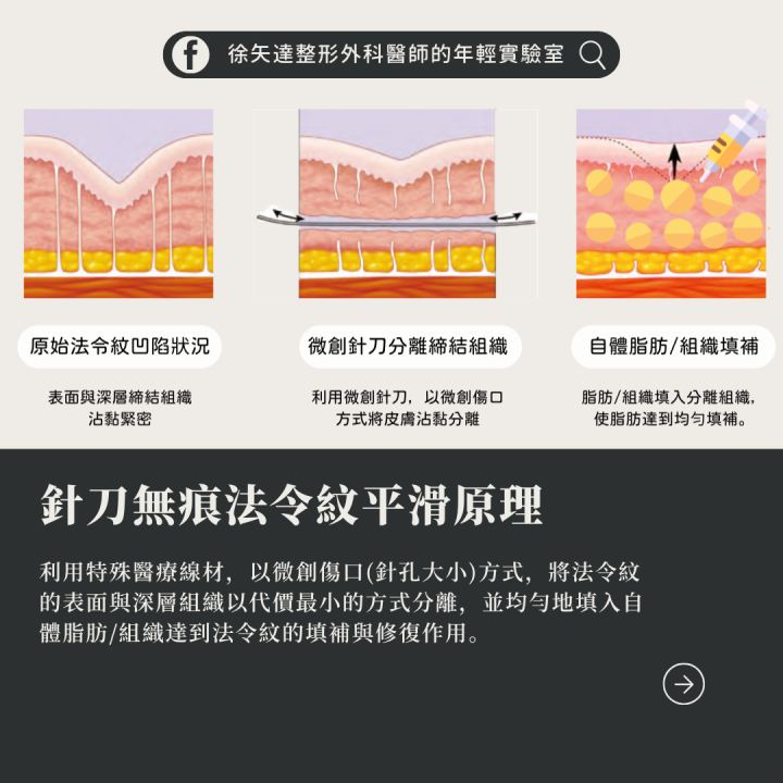 針刀無痕法令紋平滑術是一項創新且精細的微創手術技術,透過特殊的醫療線材,分離沾黏組織阻斷運動纖維後再以自體脂肪或自體組織平均填補,讓面部輪廓更加平順自然。這項技術的核心在於: