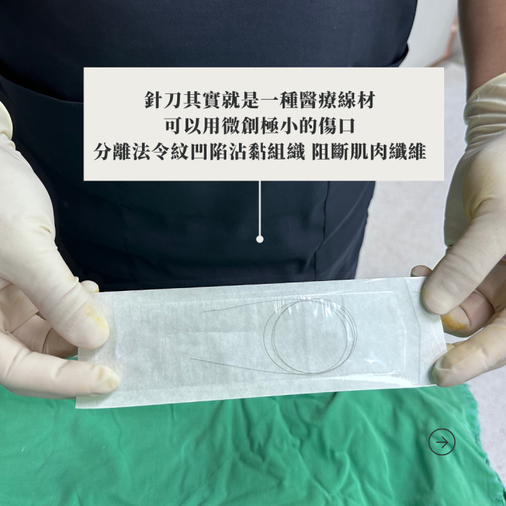 - 分離纖維組織:法令紋的形成,與肌肉纖維的過度牽拉有關。針刀可以溫和地分離這些纖維,釋放法令紋周圍的緊繃組織,為後續的填充創造更好的條件。