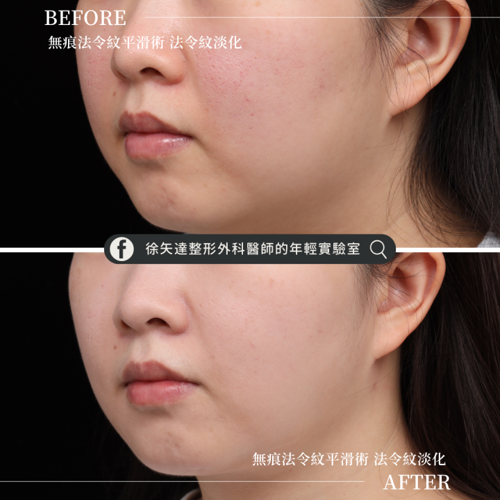 照片案例就是屬於標準有一點點鼻唇溝凹陷與嘴凸問題造成的法令紋,針對這類型的法令紋,其實也不能夠完全補到完全都看不到鼻唇溝,因為完全平滑反而讓臉部看起來不自然、假假的,像AI生成或是磨皮過頭的那種臉。因此填補的時候也會把握在最自然的狀況,改善法令紋的同時又讓人覺得不至於像是醫美臉。