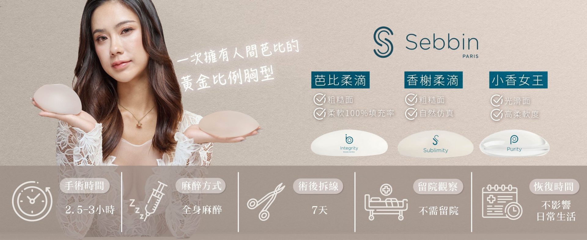 Sebbin 的乳房植體在硬度上、形狀、尺寸上有多種不同的選項,種類包含光滑的圓形植體『小香女王』、微紋理的圓形植體『香榭柔滴/芭比柔滴』